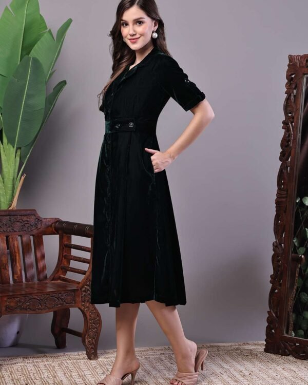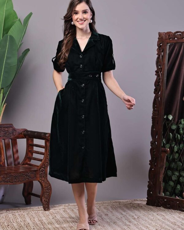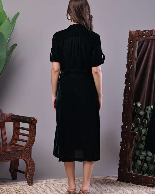 Elegant and timeless, this Bottle Green Velvet Shirt Midi Dress is designed for refined evening and smart-casual dressing. Crafted in soft, plush velvet, the dress features a structured shirt-style silhouette with a button-down front and a matching belt that defines the waist with subtle sophistication.