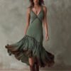 The style is French romantic. The V-neck and waist-cinching design can flatter the figure.